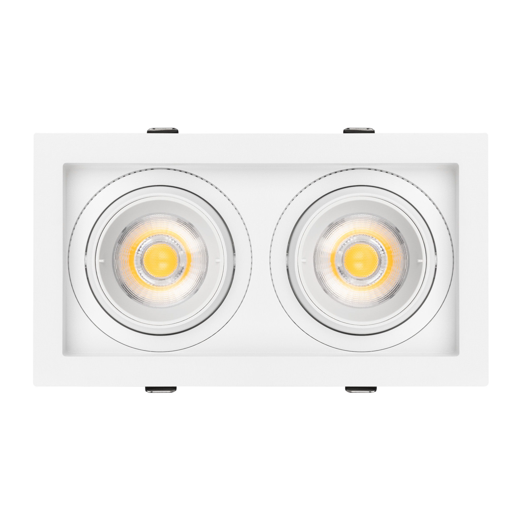 Встраиваемый карданный светильник. Мощность 2х20 Вт, св. поток 4264 лм, 106 лм/Вт, дневной 3000 K, CRI>92, угол 40°, напряжение питания 230 В. Белый корпус из алюминия, черная вставка, степень защиты IP20. Размер: длина 210 мм, ширина 117 мм, высота 105 мм. Монтаж встраиваемый, установочное отверстие: длина 190 мм, ширина 95 мм. Драйвер 24-42 В, 500 мА, пульсация <2%.